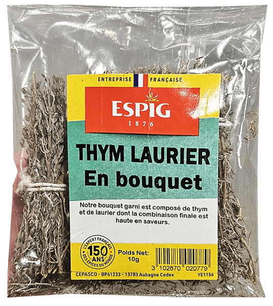 Bouquet garni associant laurier et thym, au parfum boisé et aromatique. Idéal pour parfumer bouillons, ragoûts, sauces, marinades et plats mijotés.