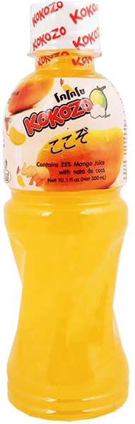 Boisson rafraîchissante au jus de mangue agrémentée de morceaux de nata de coco.
