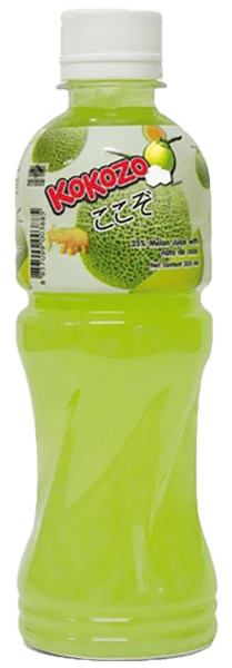 Boisson rafraîchissante au jus de melon agrémentée de morceaux de nata de coco.