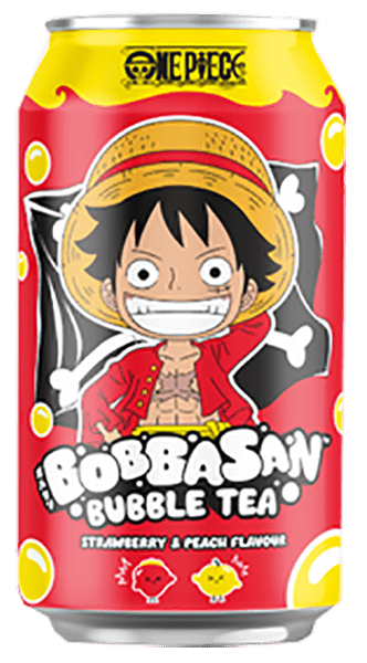 Boisson bubble tea en canette à l'effigie de Luffy de One Piece au goût fruité pêche-fraise.