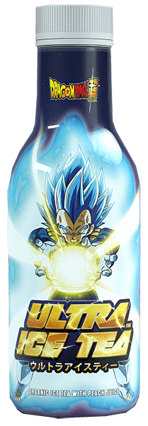 Boisson au thé en bouteille à l'effigie de Vegeta de Dragon Ball au goût fruité de pêche.