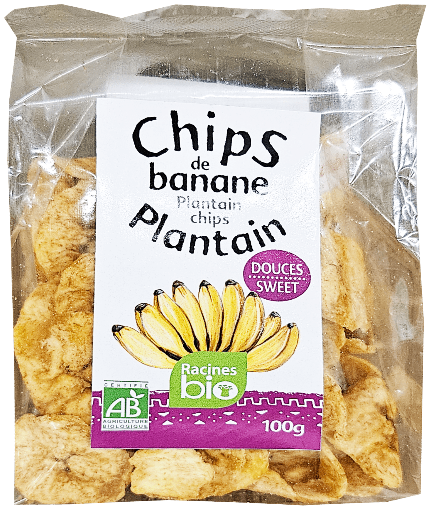 Chips de banane plantain douces à la texture croustillante et à la saveur naturellement sucrée.