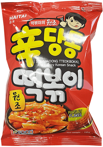 Snacks croustillants façon tteokbokki coréen au goût relevé mêlant douceur et piment.