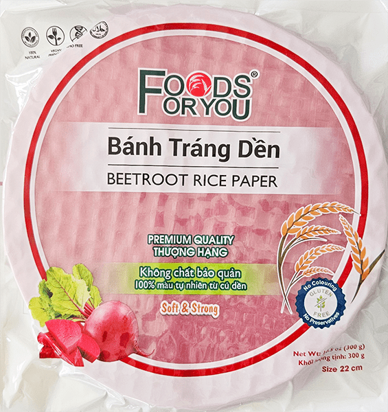 Galettes de riz vietnamiennes aromatisées à la betterave, parfaites pour des rouleaux de printemps colorés. Souples après trempage, elles offrent une texture fine et légère.