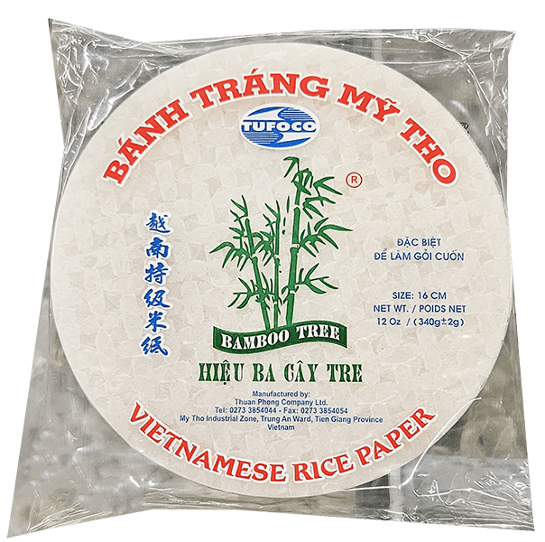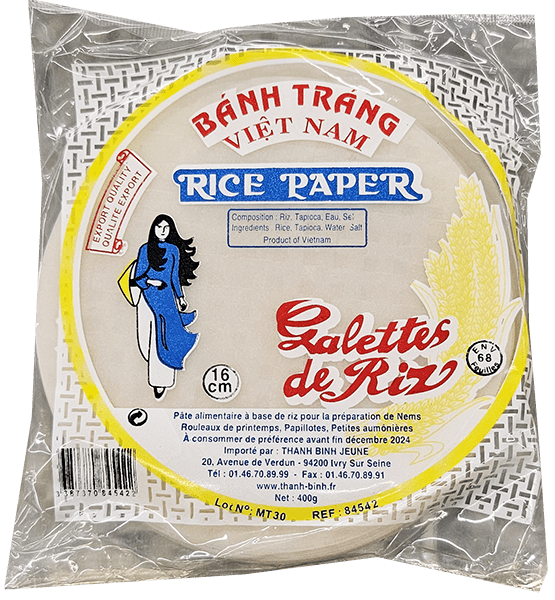 Galettes de riz vietnamiennes de 16 cm, parfaites pour rouleaux de printemps ou nems. Souples après trempage, elles offrent une texture fine et légère.