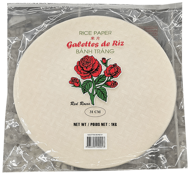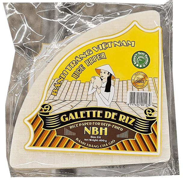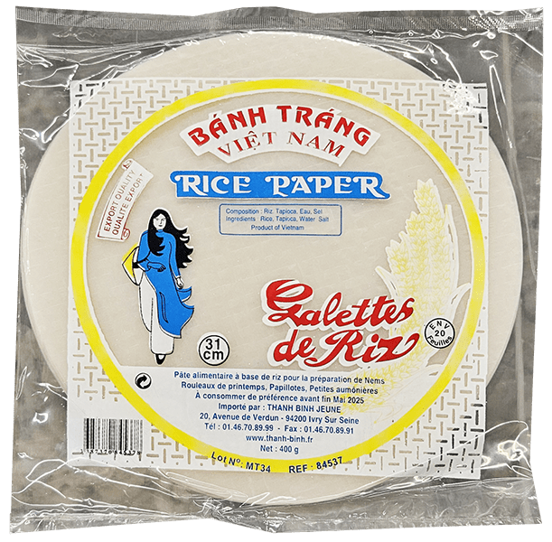 Grandes galettes de riz vietnamiennes fines et souples après trempage. Idéales pour rouleaux de printemps, nems ou créations gourmandes maison.