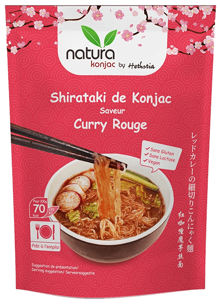 Nouilles végétales parfumées au curry rouge façon shirataki, légères et délicates, idéales pour des soupes japonaises ou woks légers et équilibrés.