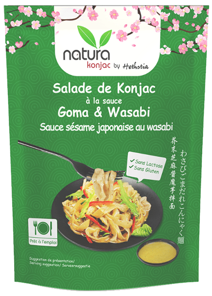 Nouilles végétales parfumées à la sauce japonaise goma au sésame et wasabi, légères et délicates, idéales pour des salades légères et équilibrées.