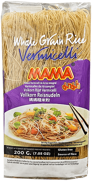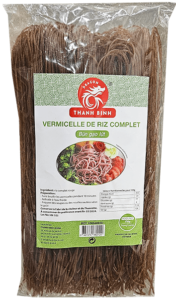Vermicelles de riz complet, riches en fibres et au goût légèrement noisetté. Parfaits pour salades, soupes ou plats sautés équilibrés.