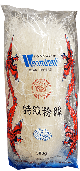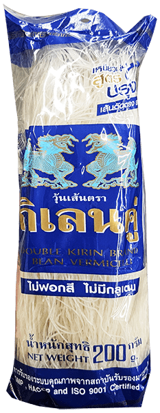 Vermicelles de soja translucides après cuisson, à la texture légère et fondante. Idéales pour soupes, salades, woks ou rouleaux de printemps.