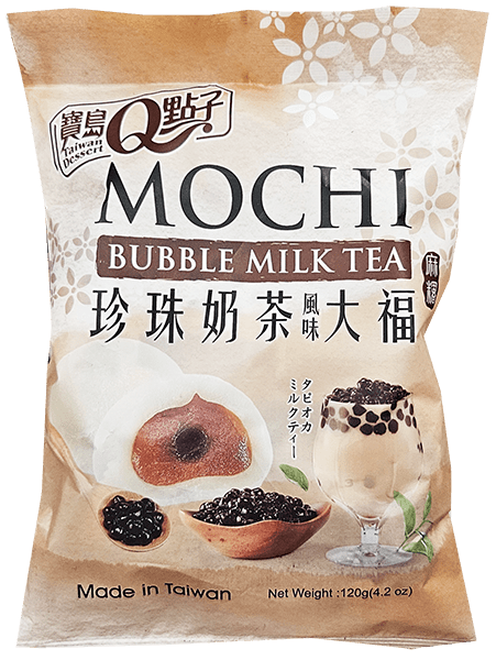Mochis moelleux à la pâte de riz gluant garnis d’un cœur fondant saveur bubble tea au lait.