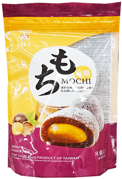 Mochis moelleux à la pâte de riz gluant fourrés d’une garniture onctueuse à la châtaigne.