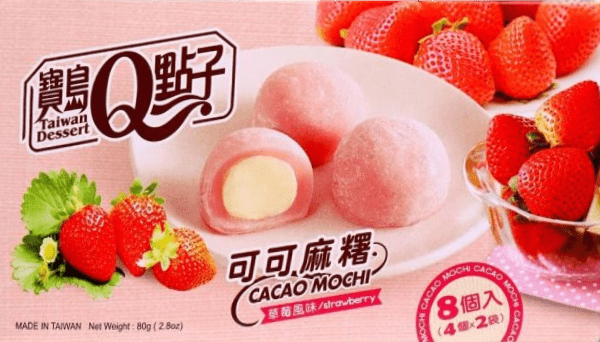 Petits mochis moelleux à la pâte de riz gluant garnis d’une crème fruitée à la fraise.