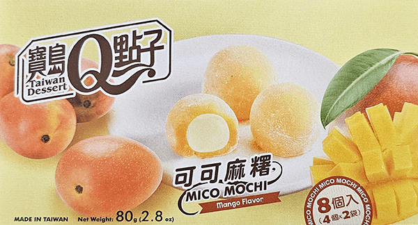 Petits mochis japonais à la pâte de riz gluant fourrés d’un cœur fruité à la mangue.