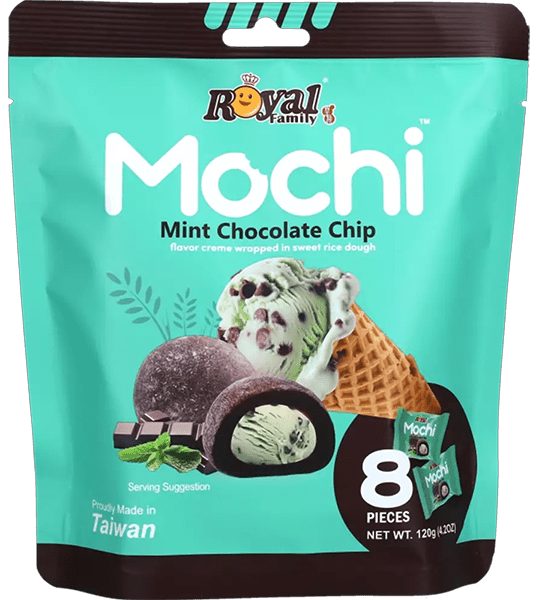 Mochis moelleux fourrés d’une crème onctueuse à la menthe et au chocolat.