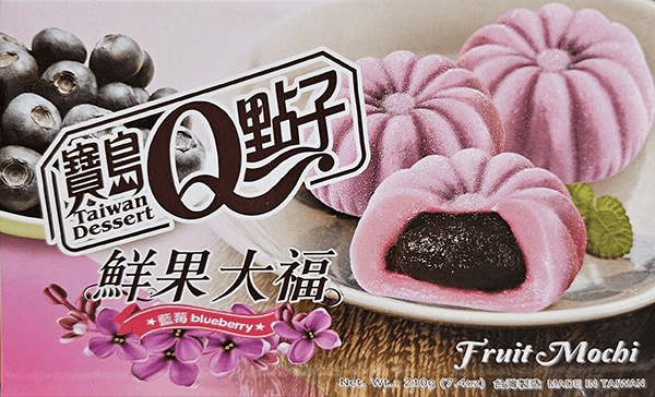 Petits mochis japonais à la pâte de riz gluant fourrés d’un cœur fruité à la myrtille.