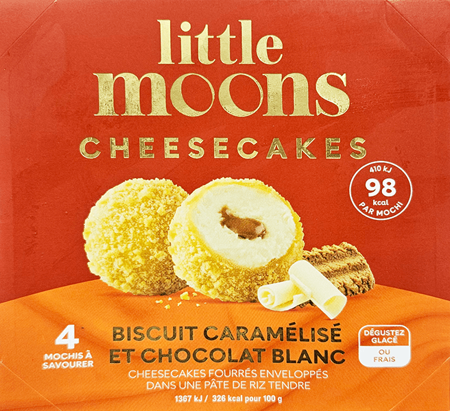 Mochis glacés à la texture moelleuse et au cœur crémeux au chocolat blanc enrobé d'éclats de biscuit au caramel.