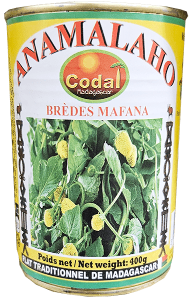 Brèdes mafane en conserve, plante au goût unique et légèrement piquant. Incontournable de la cuisine créole, idéale pour le romazava ou plats mijotés.