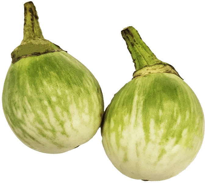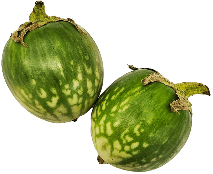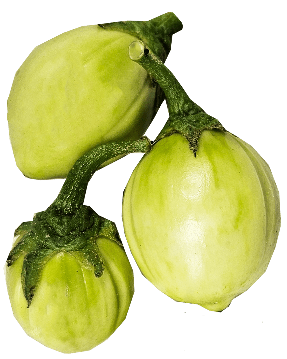 Variété d'aubergine verte à la chair ferme et à la saveur douce-amère. Idéal pour currys, sautés, soupes et grillades.