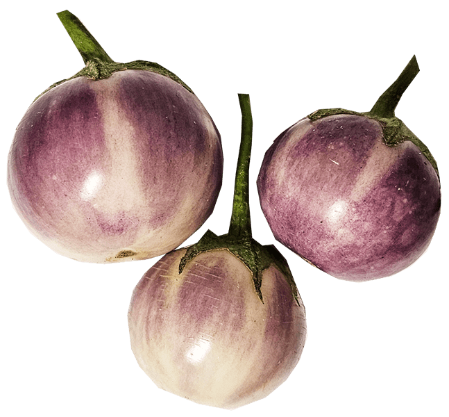 Variété d'aubergine lavande à la chair ferme et à la saveur douce-amère. Idéal pour currys, sautés, soupes et grillades.