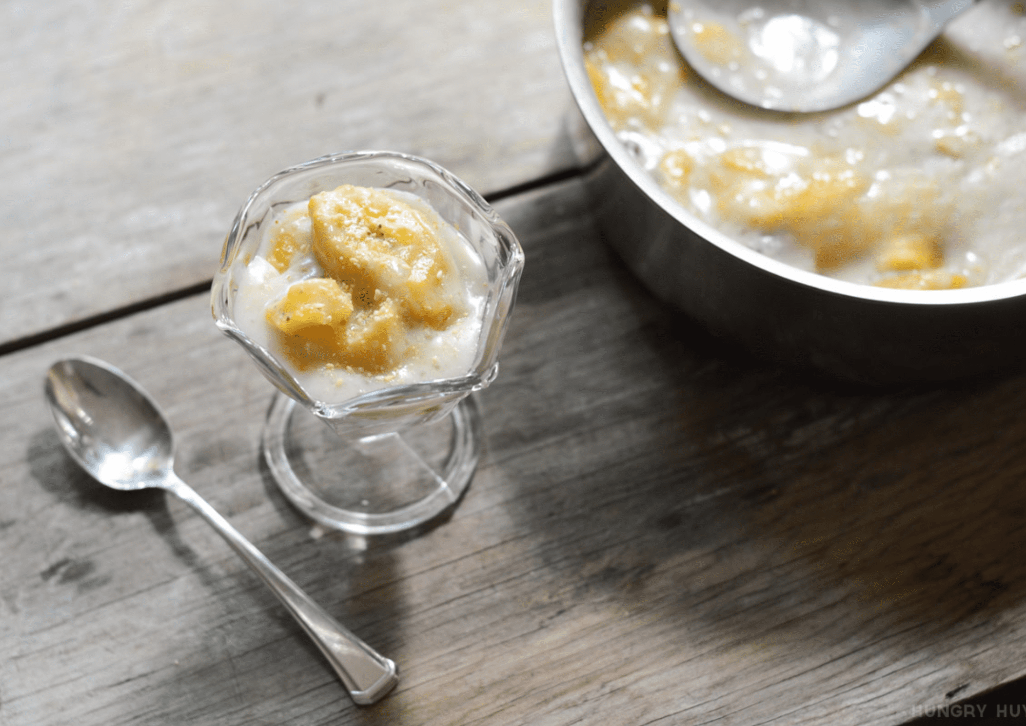 Le Chè Chuối est un dessert vietnamien à base de bananes fondantes cuites dans du lait de coco, parfumé à la vanille ou à la pandan, et épaissi avec du tapioca. C’est un mélange crémeux, sucré juste ce qu’il faut, avec une touche exotique et un léger croquant des cacahuètes.